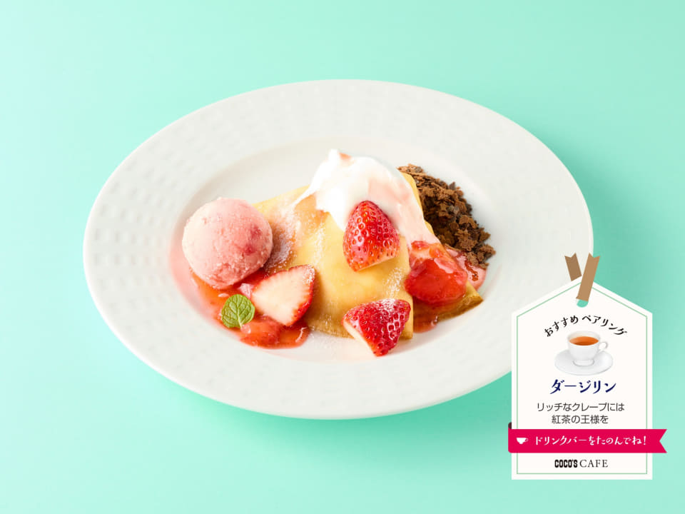 ホイップとカスタードを包んだもちもちクレープに、いちごやいちごシャーベット、ふわとろのホイップをトッピング。チョコフレークのほろ苦さやフィアンティーヌのサクサク食感が味わいと食感にアクセントを加えている。華やかで香り高い「ダージリン」との組み合わせによって上品な気分を感じることができる。