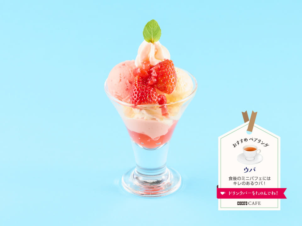 いちごやいちごシャーベット、いちごミルクプリン、いちごゼリーを使った、いちごの味わいがたっぷり詰まったミニサイズのパフェ。ホイップやバニラアイスの甘みが甘酸っぱいいちごとマッチしている。爽やかな香りが際立つ「ウバ」が相性ばっちり。