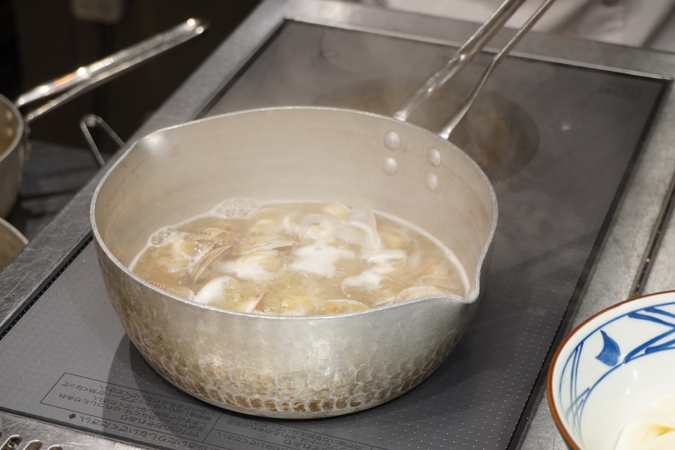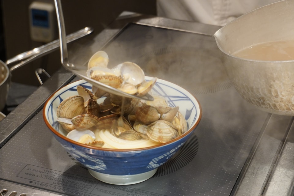 試食したところ、運ばれた瞬間から磯のよい香りが漂い、あさりの量の多さに驚いた。出汁を飲んでみると、あさりの旨みが感じられるほっとする味わい。あさりとうどんを一緒に食べれば、香り高く味わいも深く感じられた。