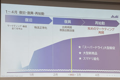 アサヒビールは都内で事業方針説明会を開催し、昨年のシステム障害からの「復旧・復興・再始動」そして「反転成長」について説明した。