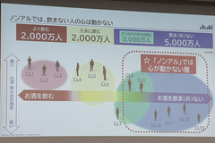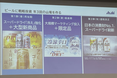 マーケティング本部長の古澤毅氏は「スーパードライ」をさらに磨き込むことと新商品の投入を反転成長の柱に据え、ビール強化の1丁目1番地として「スーパードライ」のさらなるブランド強化を図るため、3年にわたる「冷え戦略」のロードマップを提示した。