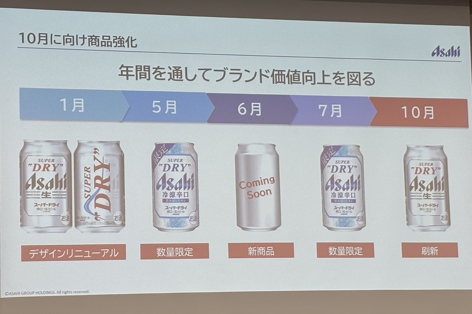 現在は物流・受注システムを「復旧」させ、SKU(商品数)の売り上げ比を9割まで戻す「復興」の最中にある。3月から4月にかけてこれを99%まで引き上げ、完全な「再始動」へとつなげる見通しだ。ビールの戦略投資では主力商品「アサヒスーパードライ」について春、夏、秋と3回の山場をつくるとともに、春には新商品「アサヒ ゴールド」を投入する。