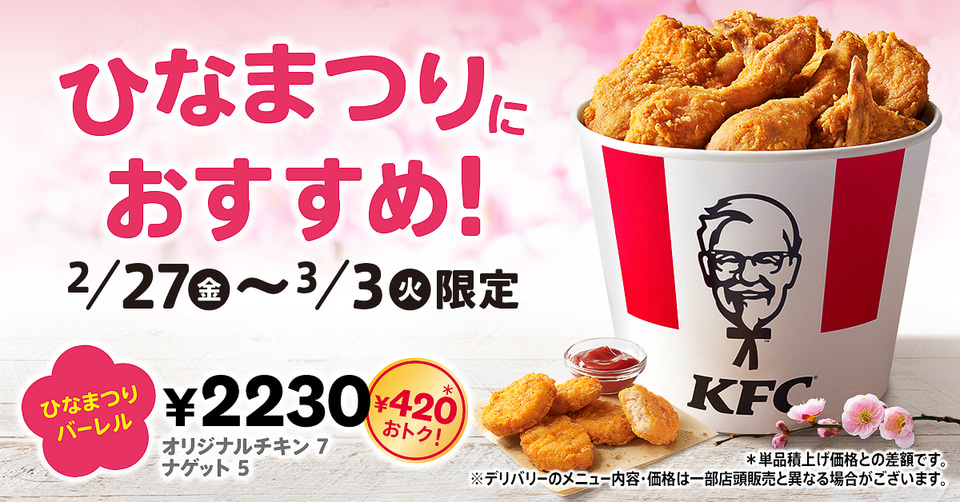 日本ケンタッキー・フライド・チキンは「ひなまつりバーレル」を2月27日~3月3日の期間限定で販売する。