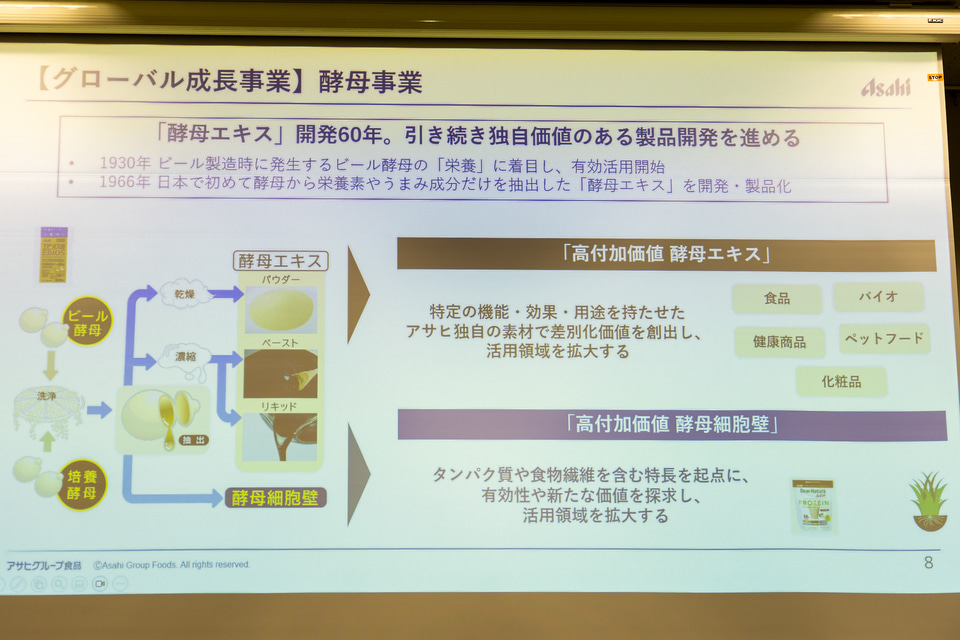 「グローバル成長事業」は、酵母エキス、酵母細胞壁という2つの高付加価値素材に注力する。酵母エキスは同社の持つ世界レベルの加工技術で、食品、バイオ、健康食品、ペットフードなどに活用領域を拡大する。