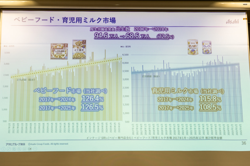 同社のベビーフード出荷金額推移は2017年から2024年で約124%の伸び率でありながらも、2025年実績はサイバー攻撃によるシステム障害の影響もあって前年比9割超と前年比割れとなった。
