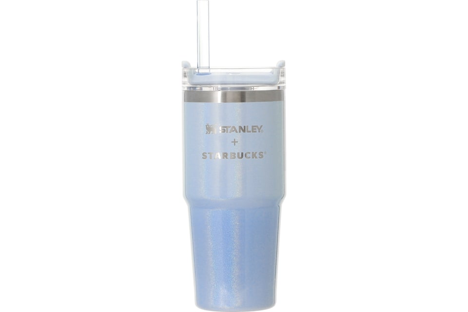 淡いブルーの「STANLEY」3wayステンレスタンブラー。春の青空を思わせる淡いブルーのグラデーションに、繊細なきらめきを添えるパール加工が施されている。リッドのカバーパーツを回転させることで「直接飲む」「ストローをさして飲む」「飲み口を閉じる」3通りの使い方ができる。淡いパープルが印象的なデザイン。