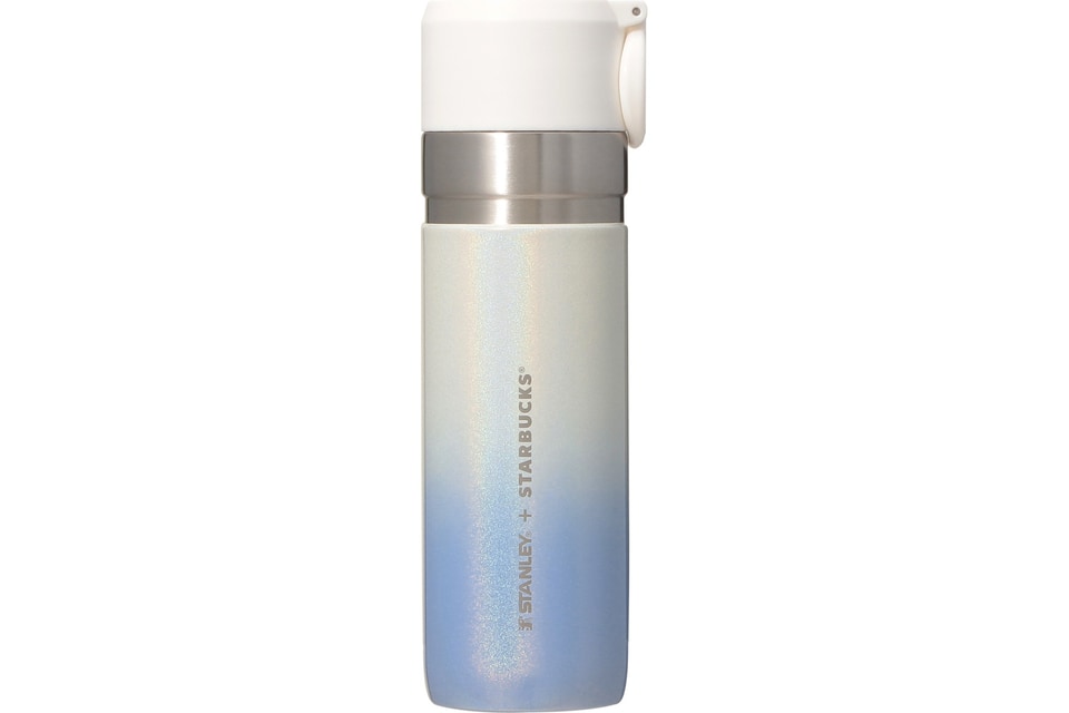 「STANLEY」の持ち運びに便利なステンレスボトルで、ブルーとアイボリーのグラデーションが優しい春の青空を思わせるデザイン。リッドに付属するフックに指を通してボトルを持ち運ぶことができる。