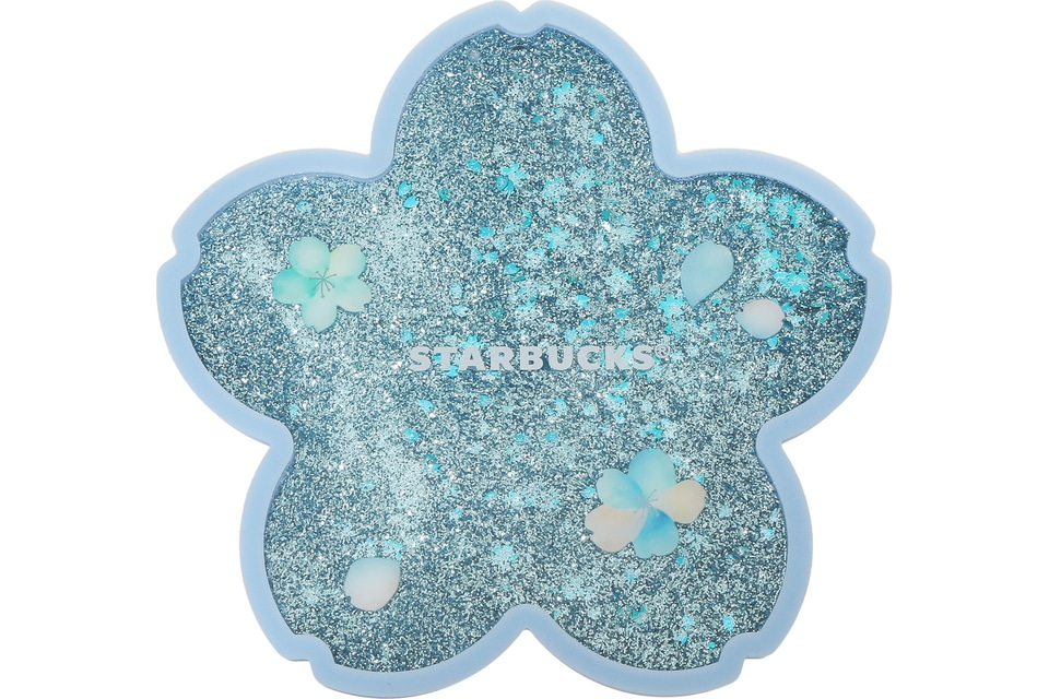 淡いブルーのグリッターが輝く本体に桜を描いたステンレスボトル。リッドの滑り止め用シリコーンバンドにはエンボス、本体にはレーザー加工でSTARBUCKSロゴを表現している。