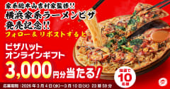ピザハット(日本ピザハット)は、好評のラーメンコラボシリーズのピザ第3弾として「家系総本山 吉村家監修 横浜家系ラーメンピザ」を3月31日までの期間限定で販売している。価格は持ち帰り2230円、配達3190円。