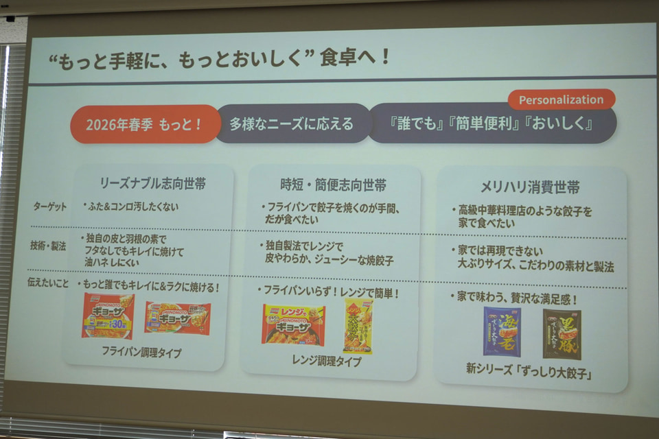 味の素冷凍食品は、「AJINOMOTO ギョーザ」をリニューアルし、フライパン調理タイプはフタなしで調理でき、かつ油ハネを劇的に減らせるようになった。また、電子レンジ調理タイプ「<レンジでギョーザ>」に、「<レンジで大餃子>」をラインアップに加え、さらに深い味わいを目指した「AJINOMOTO ギョーザ<ずっしり大餃子 海老>」「AJINOMOTO ギョーザ<ずっしり大餃子 黒豚>」を3月8日に発売する。