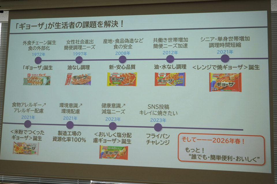 同社では発表会を開催し、リテール事業部長 内藤裕史氏が開発背景などを説明した。内藤氏は1972年に冷凍の「ギョーザ」が登場以来、毎年改定・改良を続けてきたことを紹介し、「冷凍餃子の市場規模は650億円で、レトルトカレーなどと並んで日常品に成長している。この市場規模はお客さまへの貢献の幅だと捉えており、永久改良を続けながら もっと暮らしに寄り添った商品を届けたい」と述べた。