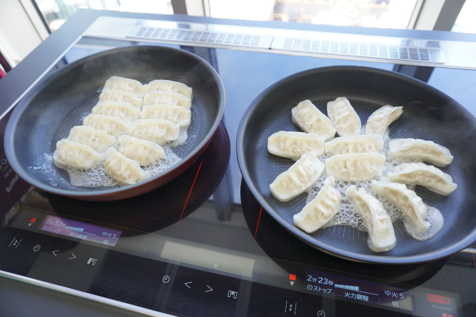 筆者は、実際に「AJINOMOTO ギョーザ」をIH調理で焼き上げるのを体験。油なし・余熱なしでフライパンに餃子を並べ、フタなしで火をつけ、そのまま中火で約10分。水分が飛んで餃子の周りに焦げができたところで火を止める。皿にひっくり返すと、きれいなハネができていた! フライパンにはまったく焦げつかず、コンロ周りには油ハネもほとんどないことを実感した。