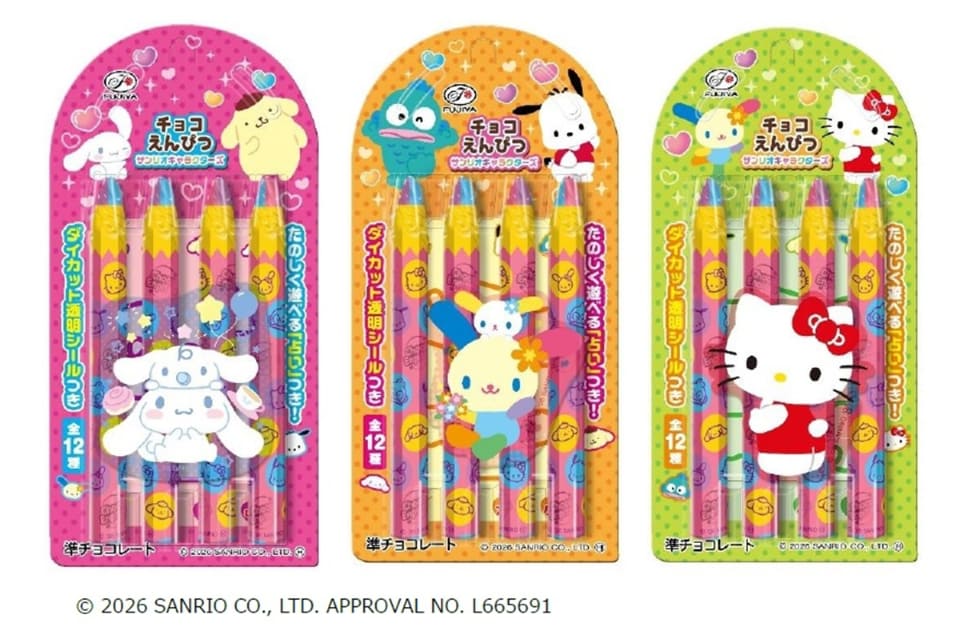 手持ちでも食べやすいアルミ個包装のえんぴつ型チョコレートで、ハローキティ、シナモロール、ポムポムプリン、ポチャッコ、ハンギョドン、ウサハナのデザインが登場している。全12種ランダムでキャラクターダイカット透明シール1枚付き。