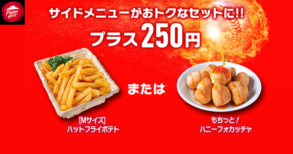 内容: 「[Mサイズ]ハットフライポテト」「もちっと!ハニーフォカッチャ」がピザとセット・持ち帰り限定で250円