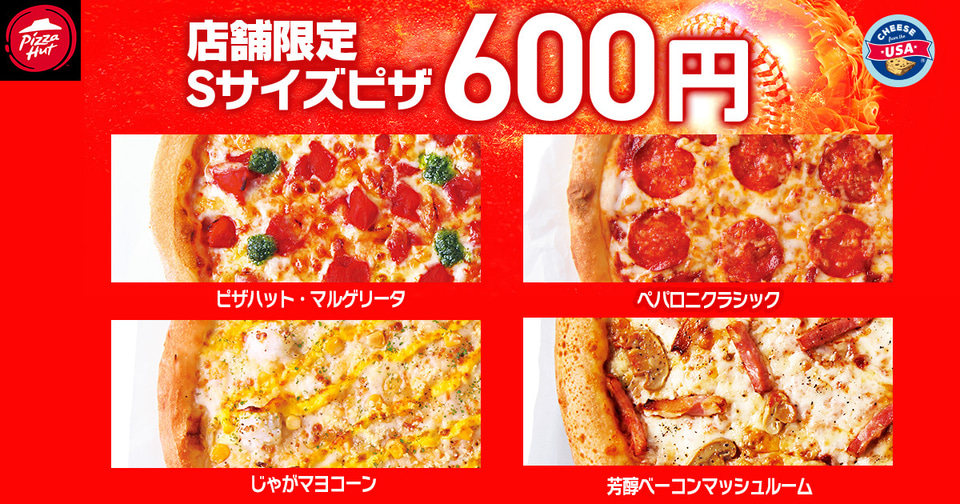 対象ピザ: 「ピザハット・マルゲリータ」「ペパロニクラシック」「じゃがマヨコーン」「芳醇ベーコンマッシュルーム」
