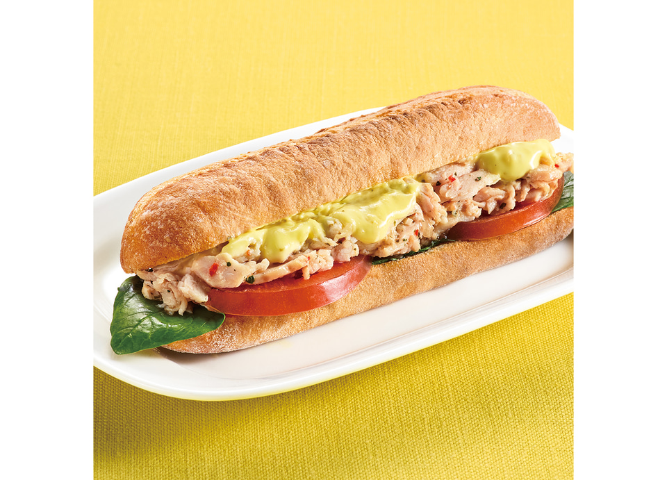 全粒粉入りパンに辛子マヨネーズを塗り、ほぐしたハーブチキンとフレッシュなトマト、サラダほうれん草を重ねた。チキンはハーブやスパイスで香り豊かに味付けした桜島鶏の胸肉を使用し、仕上げに瀬戸内産レモンを使用した爽やかな味わいのタルタルソースをたっぷりとかけている。