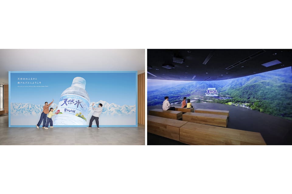 工場を囲む南アルプスの雄大な自然環境や「サントリー天然水」〈南アルプス〉ができるまでの壮大なものがたりを没入感のあるワイドスクリーンで体感できる。
