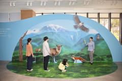 エントランスがフォトスポットとして楽しめる、壁面に描かれた雄大な南アルプスの山々と巨大な「サントリー天然水」のボトルが出迎える空間にリニューアルする。