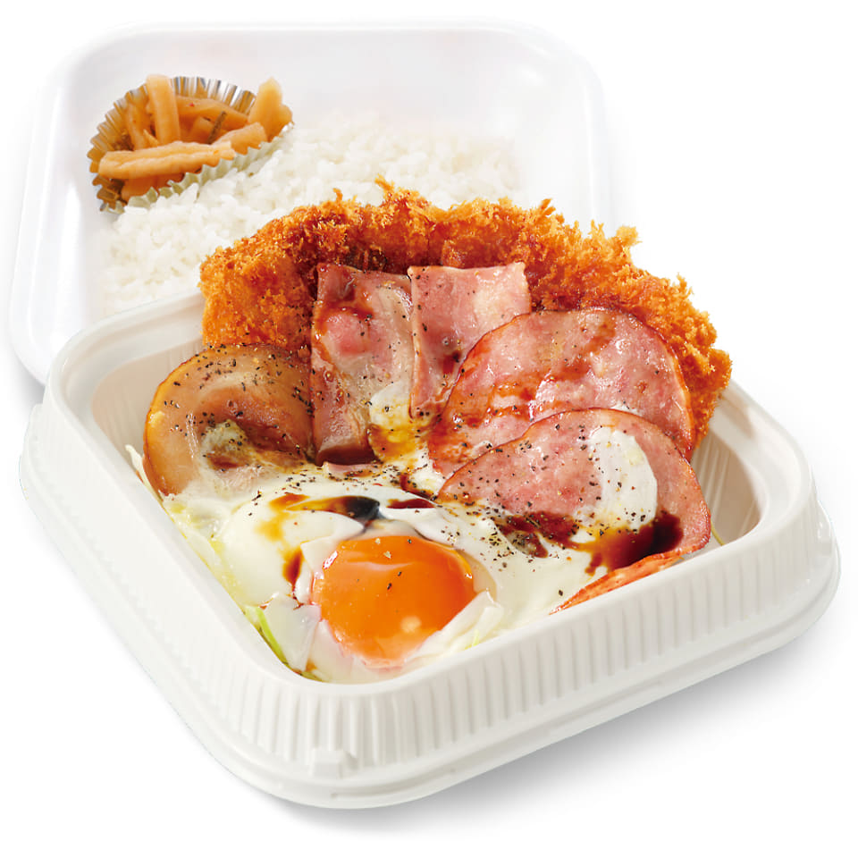 チャーシューエッグ・ベーコンエッグ・ソーセージエッグ・ロースカツを甘辛醤油タレにブラックペッパーの王道シンプルな味付けで一緒に味わえる。目玉焼きをくずしながら食べるのがおすすめだという。