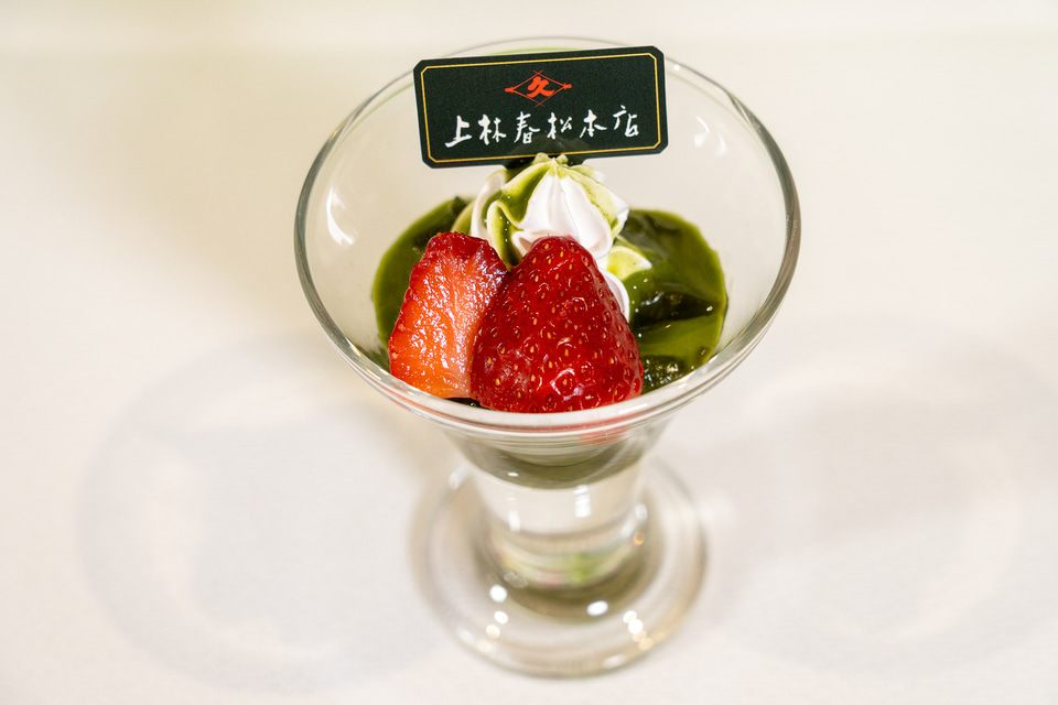 たとえば「宇治抹茶といちごの和風パフェ」は、使われているソース、クリーム、ゼリーにはすべて上林春松の宇治抹茶を使用。ひとくち目から最後まで、どこから食べても豊かな抹茶の香りを堪能できる。