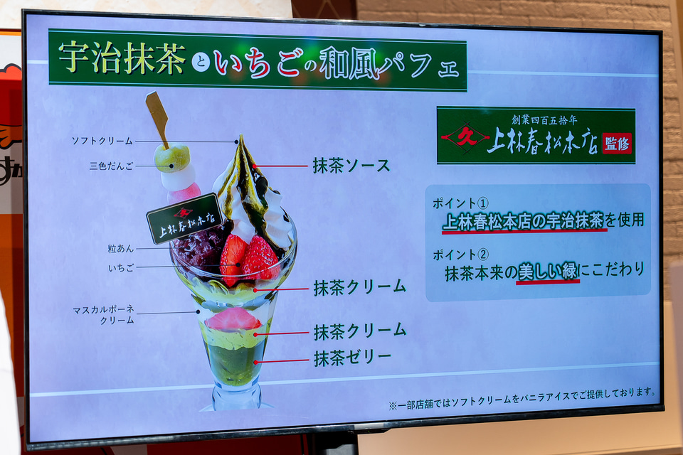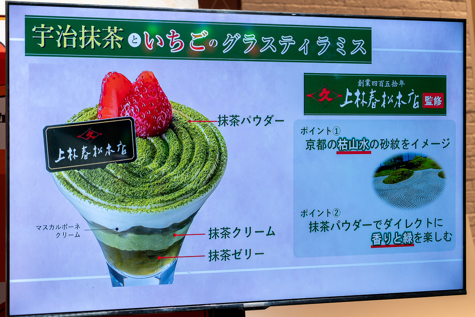 450年の歴史を持つ老舗茶舗「上林春松本店」とコラボした「宇治抹茶といちごのスイーツ」は、和風パフェ、ティラミス、あんみつ、大福、ゼリーの5品がラインアップする。宇治抹茶本来の美しい緑と香り、奥行きのある味わいをベースに、旬のいちごとマッチングすることで春らしい和スイーツとなっている。