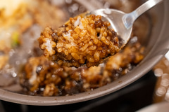 鉄鍋で提供される「THE 職人ビーフハンバーグ」は、目の前で濃厚なデミグラスソースをさらに煮込みながら食べるライブ感が楽しめる一品。パテは粗挽きの牛肉100%で、つなぎを使っていないため牛本来の旨みを味わえるのも特徴だ。