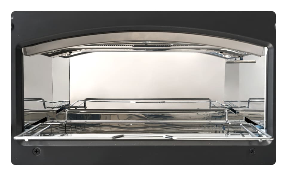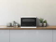 外観は、操作パネルに浮き出る静電タッチパネルを採用することで、凹凸の少ないシンプルなデザインを実現している。脚カバーとパンくずトレイは一体化しており、見た目塗装時のしやすさを両立した。インテリアと調和しやすい設計でありつつ、使用時は庫内が明るくなることで、扉のドーム型と合わせて石窯を彷彿とさせる外観に変化する。