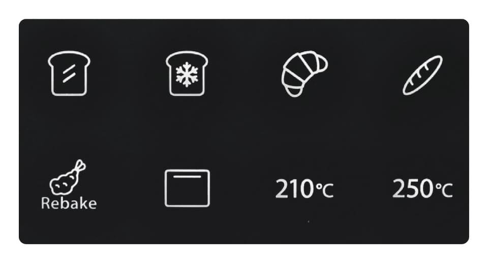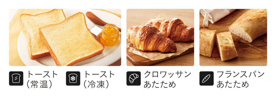 自動メニューは、トースト(常温・冷凍)、クロワッサン、フランスパンの4つを搭載しており、焼き加減は5段階から選べる。さらに、惣菜パン用と揚げ物用のリベイクメニューも搭載。タッチパネルでメニューを選びスタートボタンを押すだけで、食材に適した最適な焼き上がりに仕上がる。また、上下ヒーター加熱によるオーブン機能では、210℃もしくは250℃の温度で最大30分まで設定可能で、本格的なオーブン料理にも対応している。