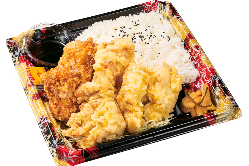 ・「とり天倍盛り合盛り弁当」(1177円/券売機店舗は1200円)