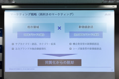 マーケティング方針については、常務執行役員でマーケティング本部長の相田幸明氏が説明した。現在、マーケティングについてはAIを活用したプロセス改革を行っており、インサイト発掘、生声の検証、シーズの受容性の検証から商品コンセプト立案までを行なっている。AI活用によって生まれた時間は、大学生との共創を含む生声の収集、国内外のシーズの探索・収集に当てるなど、より効率的なマーケティング活動に使っているとのこと。