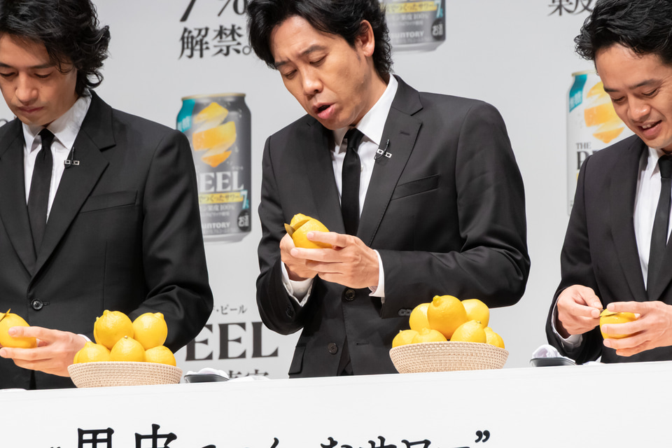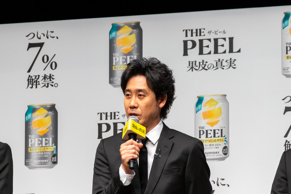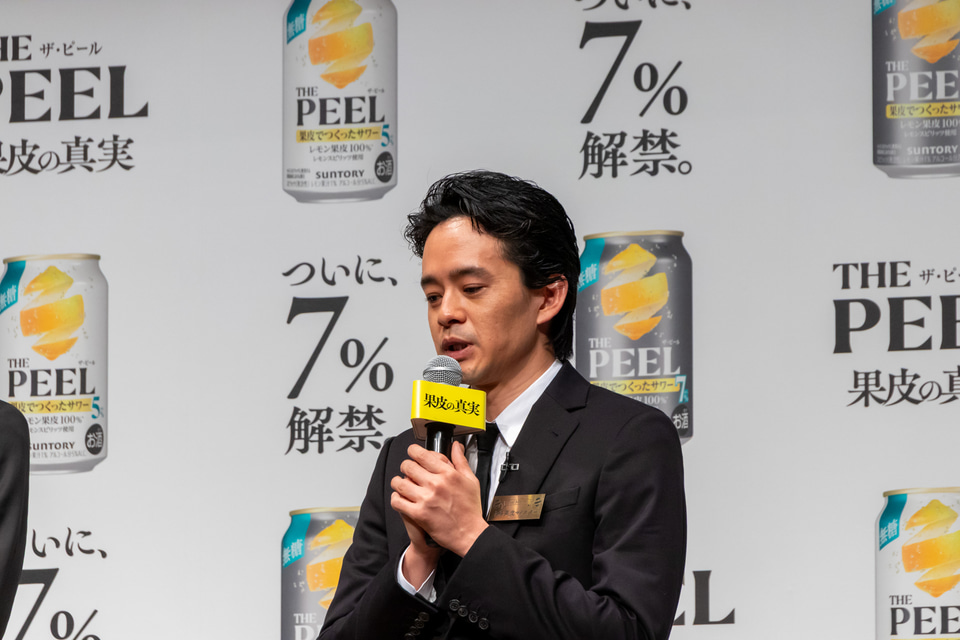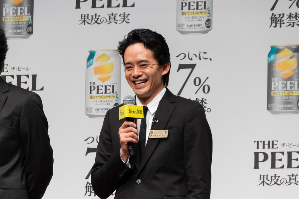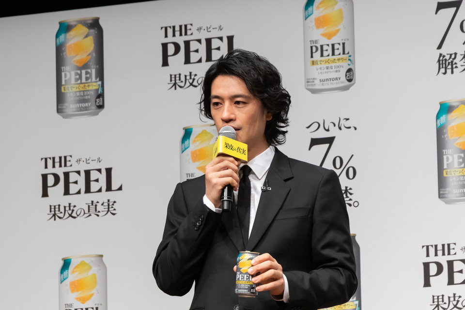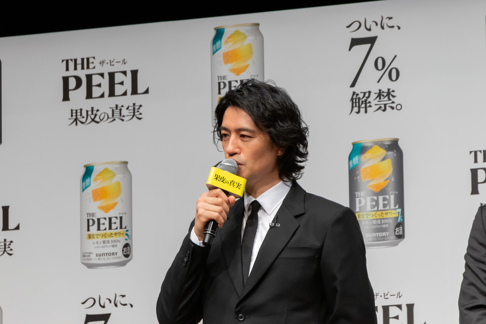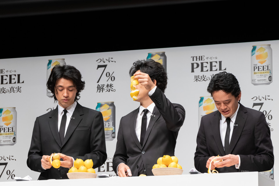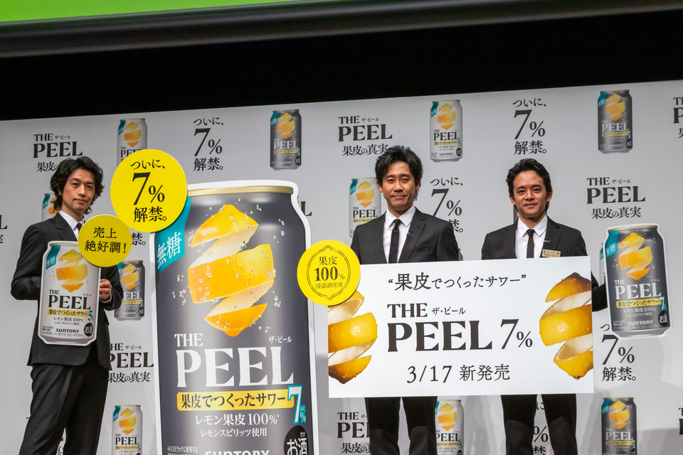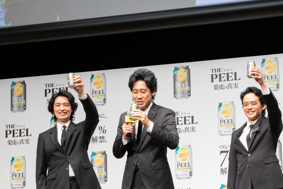 サントリーは3月17日に発売する「THE PEEL(ザ ピール)〈レモン〉ALC(アルコール).7%」と「THE PEEL〈レモン〉ALC.5%」の商品説明・新CMの発表会を開催。新CMに出演する、大泉洋さん、斎藤工さん、池松壮亮さんがゲストとして登壇した。