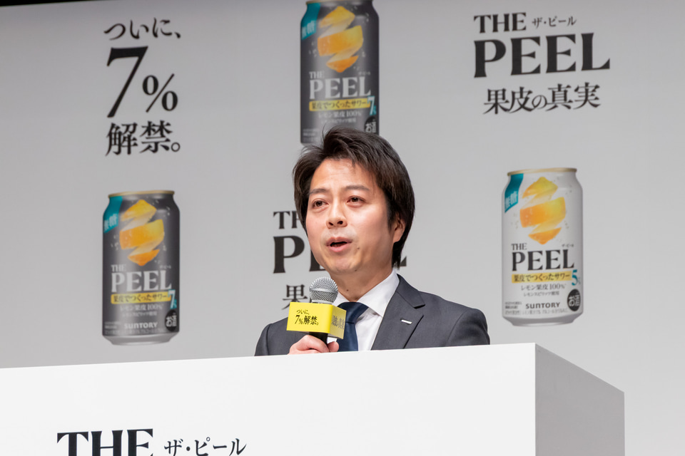 新商品「THE PEEL〈レモン〉ALC.7%」については、「既存製品の余韻のよさはそのままに、果皮由来のコク、苦味をさらに引き出すことで飲み応えを強化いたしました」と説明し、多彩なレモン果皮蒸留酒、浸漬酒などを使って、ベストなバランスを追求した商品であると話した。