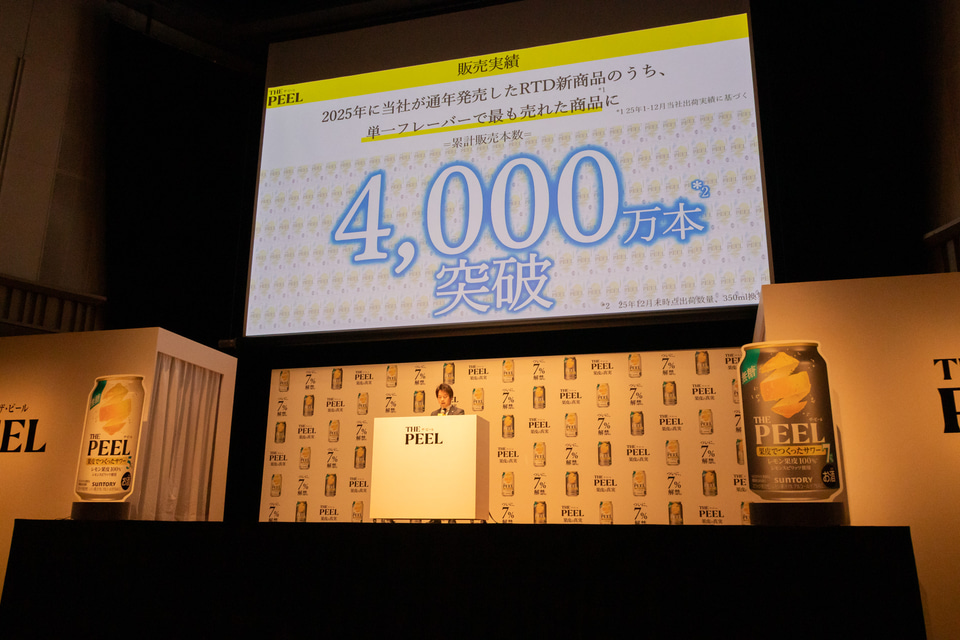冒頭の商品説明ではマーケティング本部 ビール・RTD部の部長である中野景介氏が登壇し、「THE PEEL」ブランドについて説明した。2025年4月に発売した「THE PEEL〈レモン〉ALC.5%」は、「狭義ビールとRTDの間に位置する、いわばサブカテゴリーを作ることを狙いに開発いたしました」と説明するように、ビール類の中でも今後さらに伸長が見込まれる狭義ビール(麦芽使用比率が50%以上)の購買層をターゲットにしている。その狭義ビールを好むユーザーがRTD(缶チューハイなどの低アルコール飲料)に対して抱いている「甘くて食事に合わない」「本格・品質感が低い」というイメージに対する答えとして開発したのが、甘くない“果皮でつくったサワー”の「THE PEEL」であると説明した。ターゲット層から高評価を得た結果、12月末時点で販売本数は4000万本を突破し、当日には5000万本に達したことを報告した。