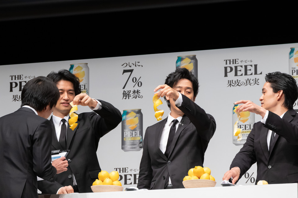 果皮むきに取り掛かった3人のうち、普段あまり料理はしないという池松さんが皮を切ってしまうとすかさず大泉さんが「契約終了―!!」と叫ぶなど波乱の展開。それでも、最後までていねいに“細く長く”を徹底した池松さんが「本格果皮マイスター」の称号を手に入れた。判定した中野氏に対して大泉さんは「僕は“本格果皮マイスター”という称号がすごく欲しいのに、池松くんは欲しそうじゃない!」と悔しさをにじませ、その隣では称号を手に入れた池松さんが素直に「やった~うれしい!」と喜んだ。果皮むきチャレンジの後は3人で乾杯を行ない、「THE PEEL〈レモン〉ALC.7%」を楽しんだ。