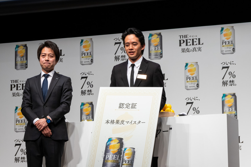 トークショーの中では、“果皮の真実”を紐解くために果皮むきにチャレンジする一幕もあった。レモン果皮を構成する「アルベド(内果皮)」と「フラベド(外果皮)」の違いがあり、新開発したアルベドの浸漬酒は、さわやかな苦み、味の厚みをもたらしている。この特徴を紹介するために昨年も見事な果皮むきを披露した大泉さんは「1週間前から練習していますよ!」とニヤリ。 果皮むきチャレンジの判定基準は“とにかく綺麗に長く剥けているか”であり、斎藤さんが「先ほど裏で大泉さんが“途切れたら契約がそこまでだという気持ちでやろう”と言っていました(笑)」と暴露すると会場は笑いの渦に包まれた。