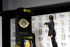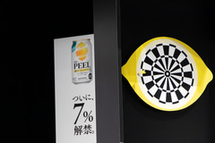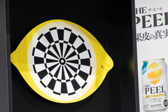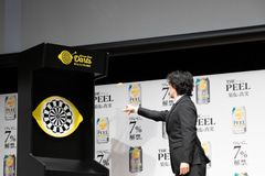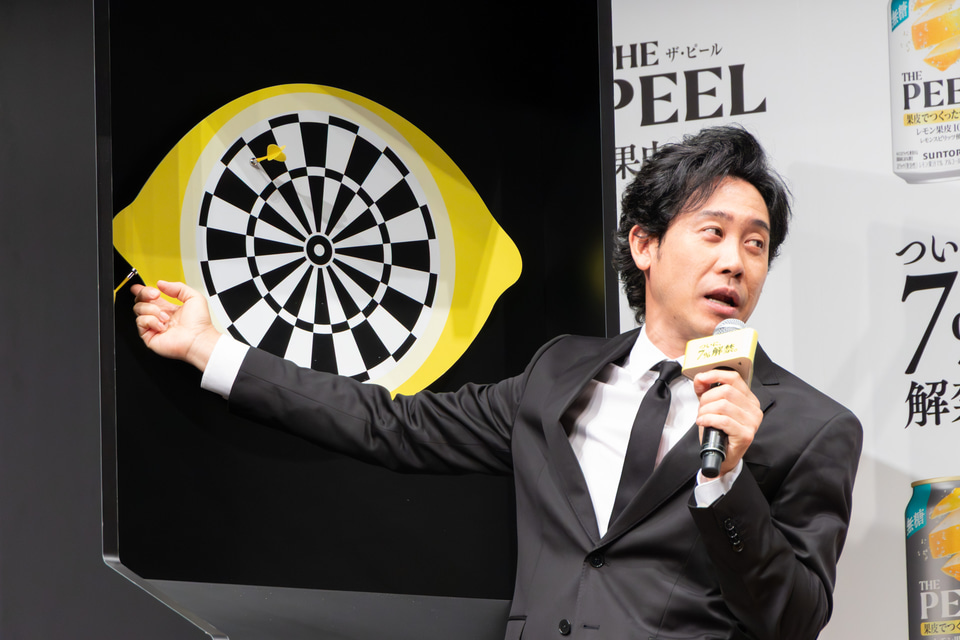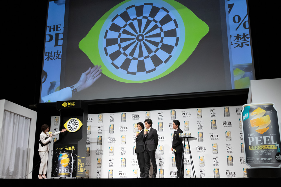 最後は「THE PEEL」が体験できるということで東京ミッドタウン日比谷アトリウムに2日間限定(3月20日/21日)の「THE PEEL BAR」がオープンすることが発表された。そこには果皮を狙う「レモンピールダーツ」が設置されるとのことで、一足先に3人も体験することになったが、それぞれが「THE PEEL」のこだわりをコメントしながらというお題付きでもあった。大泉さんには「果皮だから余韻がケタ違い」、斎藤さんには「果皮にこだわり抜くから本格的」、池松さんには「楽しみ方は5%だけじゃない、7%登場」のセリフが課された。「果皮に当たらなかったら契約終了?(笑)」とすでにノリノリの大泉さん。