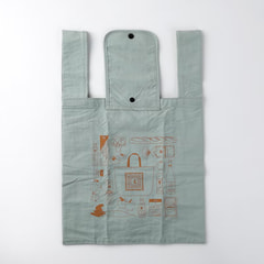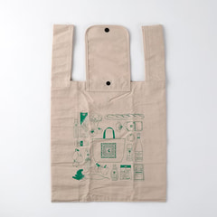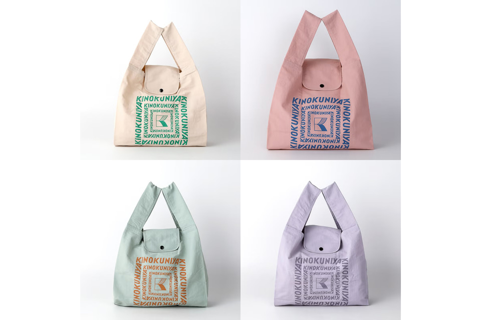 エコバッグ「スモールショッパー」の新色はやわらかなパステルカラーの4色。片面にはいつもの紀ノ国屋のロゴを、もう片面にはパスタやパン、果物などをモチーフにしたイラストをあしらっている。