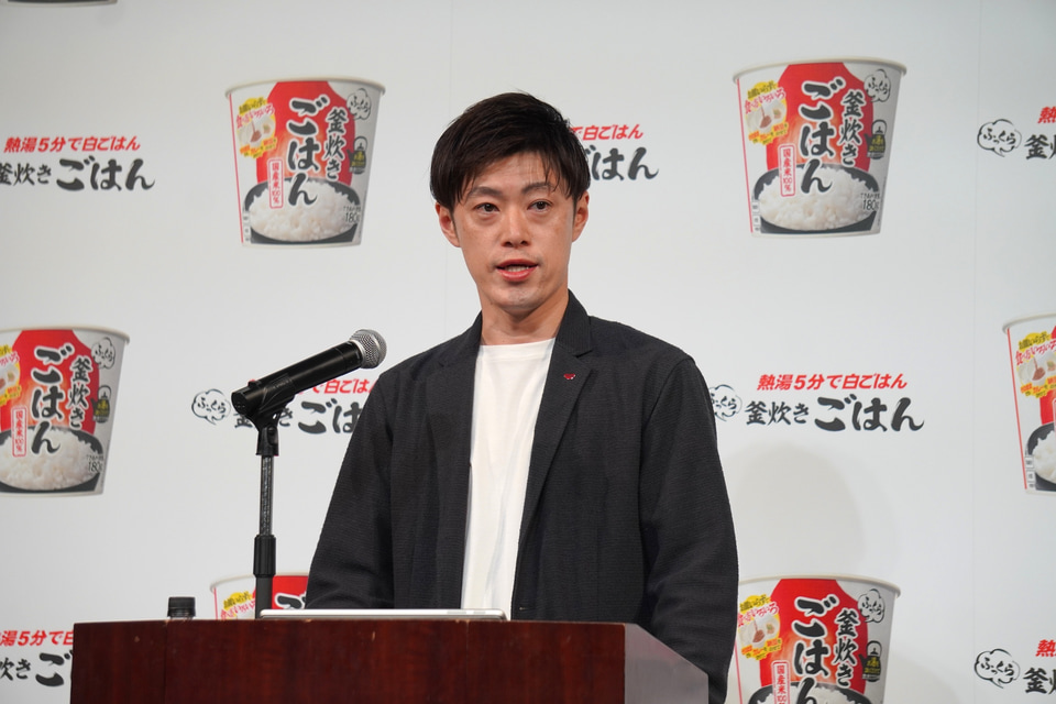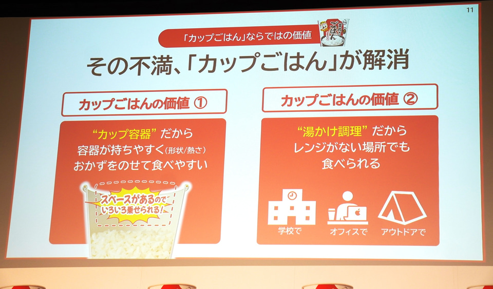 今回投入する「日清ふっくら釜炊き ごはん」はカップ容器を採用しているため、容器が熱くなりにくく持ちやすいこと、ごはんの上にスペースがあるので具材などをのせやすいこと、湯かけ調理なので学校やオフィス、アウトドアなどでも活躍できることをアピール。「皿に移したりする必要もないので、さっと食べられそのまま捨てられる」と述べた。