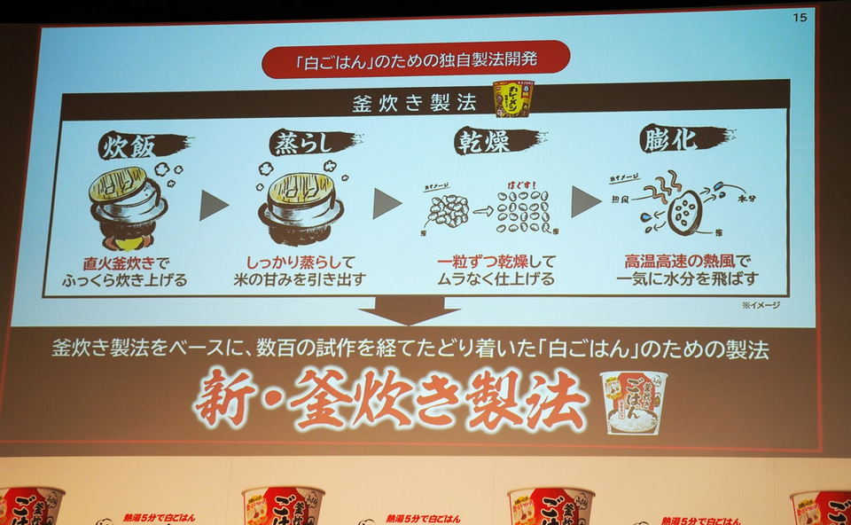 一方で、「簡便でありながら、おいしい白ごはんであることが重要だった」と話し、おいしさを生み出す「新・釜炊き製法」を紹介。通常と同様に釜で炊飯して蒸らす。その後一粒ずつ高温乾燥し、中の水分を一気に飛ばす“膨化”を行ない、おいしさを担保しているという。「炊きたてのような香りにもこだわったのでぜひ試してほしい」と中村氏は話した。