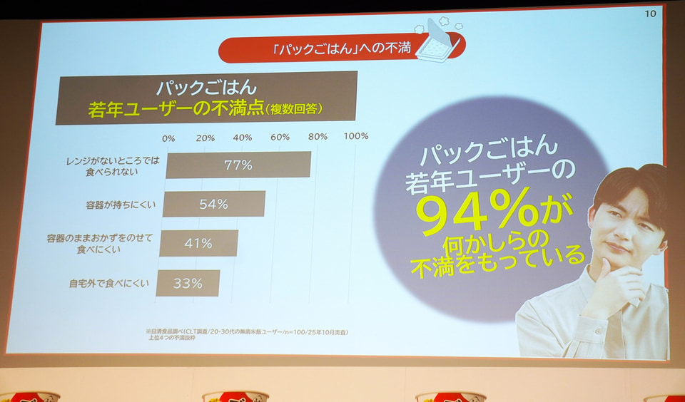 中村氏は通常の“炊くお米”の市場規模が縮小傾向にあるが、パックごはんに代表されるような“炊かれたお米”の市場規模は2022年2250億円で2010年から約1.5倍になっており、2030年までに3000億円になると予測。一方で、パックごはんは若年ユーザーを中心に「レンジがないところでは食べられない・容器が持ちにくい・容器のままおかずをのせて食べにくいという不満がある」と中村氏はアンケート結果を紹介した。