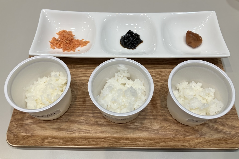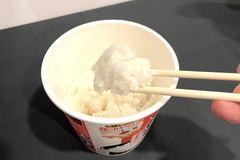 会場では「日清ふっくら釜炊き ごはん」と「パックごはん」「アルファ米」3種の食べ比べが行われ、実際に比較しながら食べてみた。見た目のツヤはパックごはんの方がややツヤがあるように思うが「日清ふっくら釜炊き ごはん」は「乾燥されていたところから」という前提で見ると、ここまでツヤが出るのは驚きだった。そして香りは、炊きたてに近いよい香り。食べてみるとふっくらしており、おいしい! インディカ米などのようなぼそっと感はなく、ごはんの友と一緒に食べるとごはんが進む味わいだった。