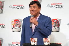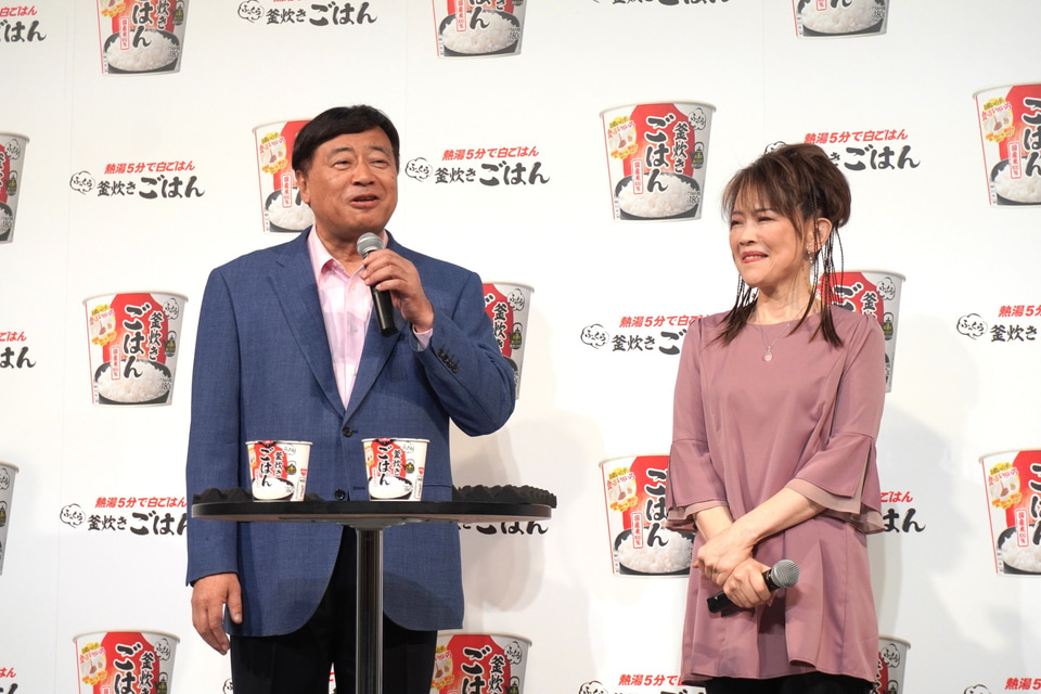 発表会後半では、テレビCMに登場する通販会社である夢グループの石田重廣社長と保科有里さんが登壇。石田社長と保科さんは「熱湯5分で白ごはんが作れちゃう、カップ型の便利な商品なんですよ~」「5分でごはんが作れちゃうなんて、すご~い」というやり取りを交えながら紹介。