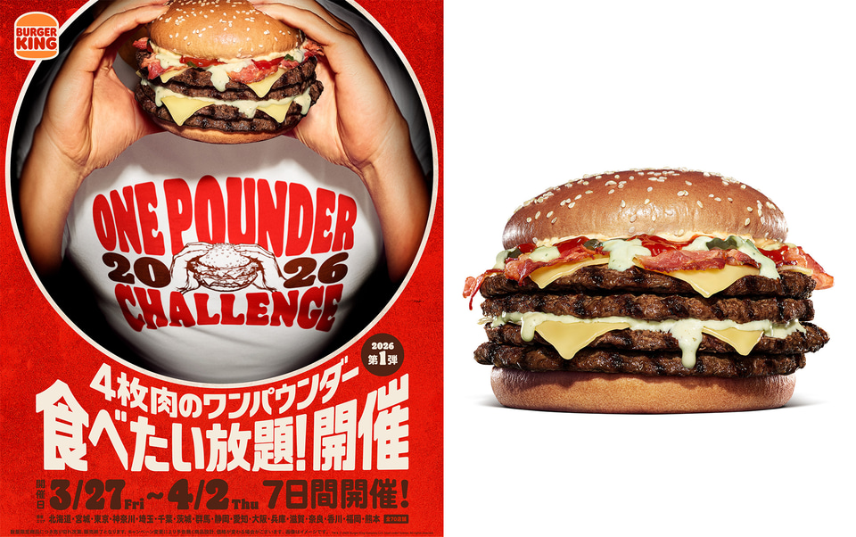 バーガーキング(ビーケージャパンホールディングス)は、ビーフ4枚を使った「ワンパウンダーシリーズ」の食べ放題イベント「ワンパウンダーチャレンジ2026」を年3回、12月には「ワンパウンダーチャレンジ2026 ファイナル」を実施すると発表した。第1弾の受付は3月18日11時より開始した。