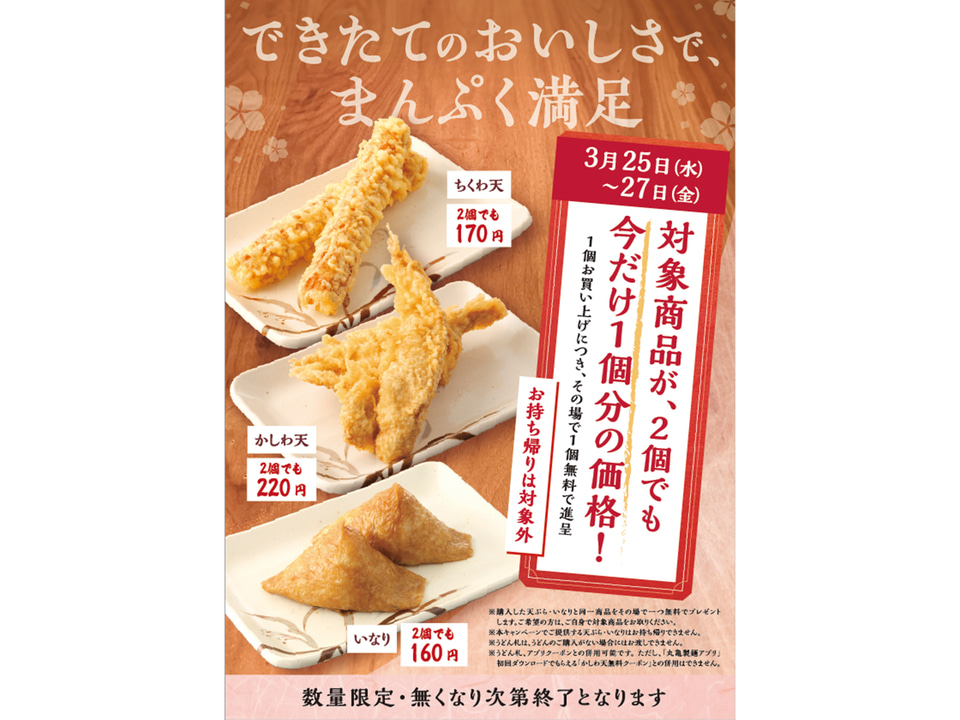 丸亀製麺「ちくわ天」「かしわ天」「いなり」が“もう1個”もらえる「1個購入で1個無料」キャンペーン