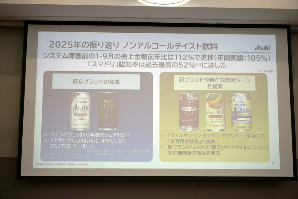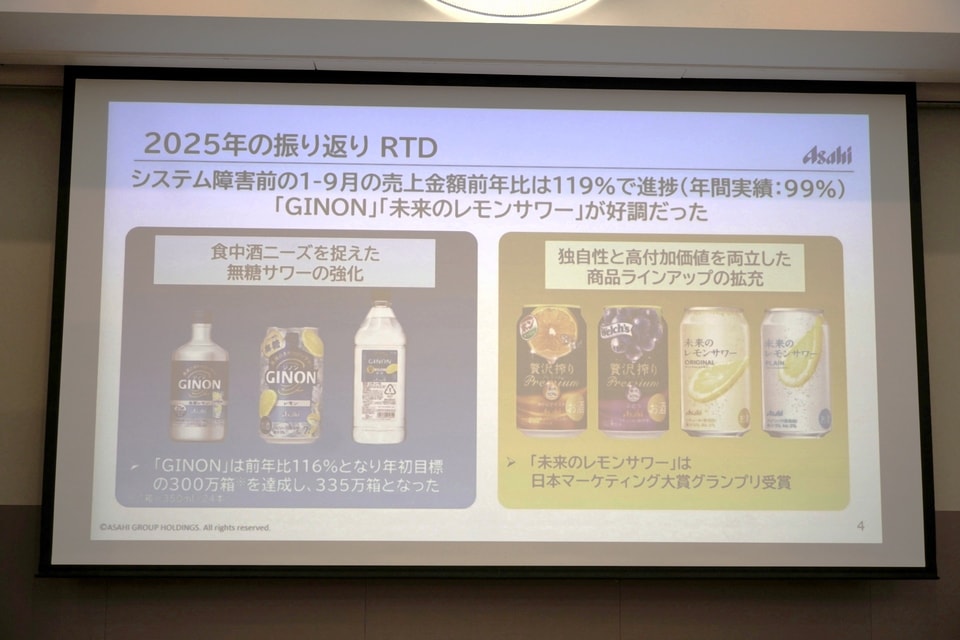 古澤氏は2025年の缶チューハイなどのRTD(Ready to Drink)飲料の売上金額前年比は、9月末に発生したシステム障害前の1~9月では119%、年間実績で99%、ノンアルコールテイスト飲料では1~9月112%、年間実績で105%と、障害の影響はあったものの堅調に推移したことを報告。中でも無糖サワーの「GINON」、レモンスライスが入った「未来のレモンサワー」、ノンアルでは「ドライゼロ」などが好調だったという。