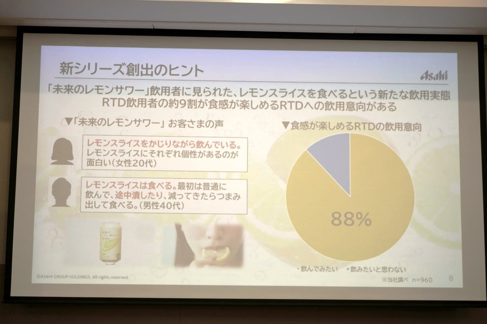 そしてユーザーから「未来のノンアル レモンサワー」への声として「レモンスライスをかじりながら飲む」「レモンスライスをつぶして飲む」などがあがったことに着目。古澤氏は「食感の驚きやおいしさ、高揚感や五感で楽しめる体験を提案したく『まるごと食感サワー』シリーズを立ち上げた。『飲むサワー』から『まるごと食感を味わうサワー』へ進化させたい」と述べた。