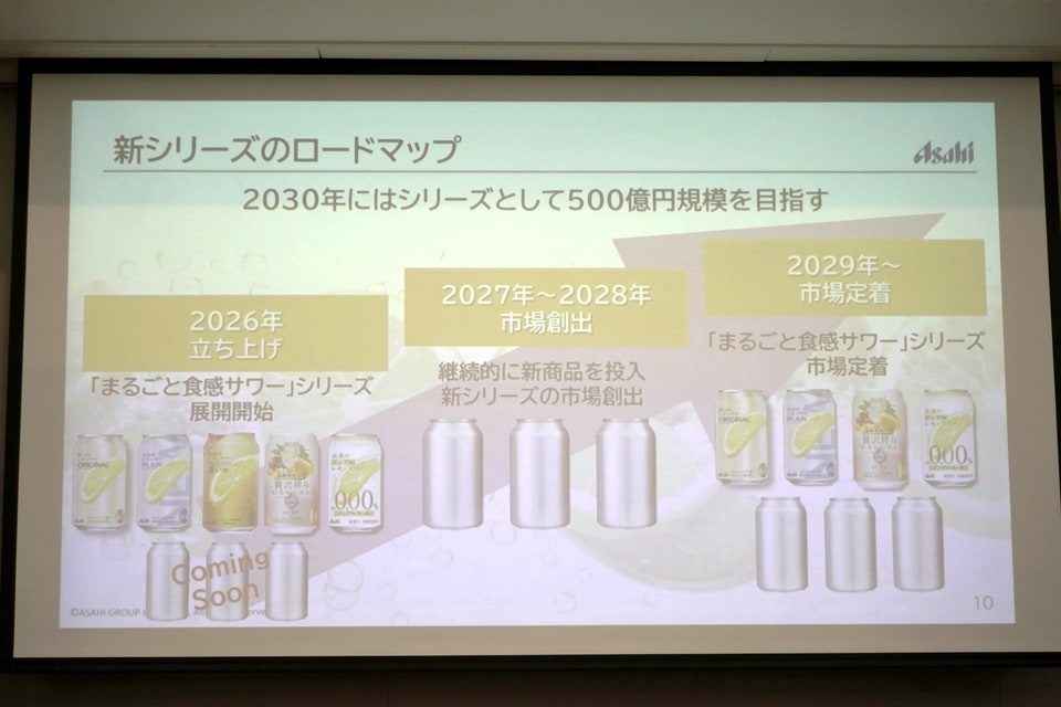 「まるごと食感サワー」シリーズは今後、ブランドの垣根を越えて新商品を投入していき、2029年に市場に定着させ、2030年にはシリーズとして500億円の規模を目指すとしている。