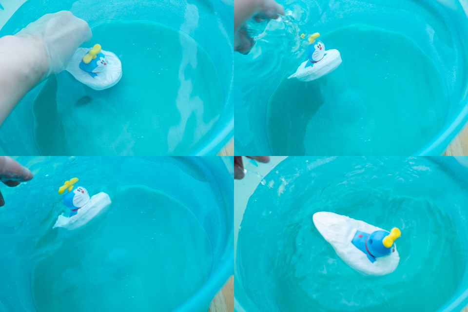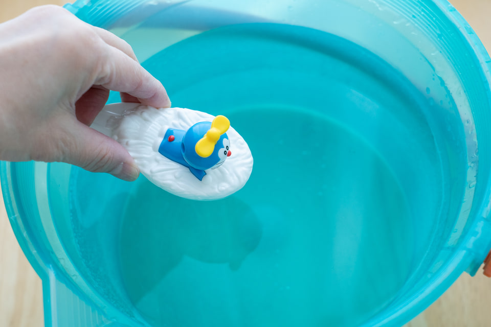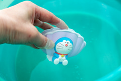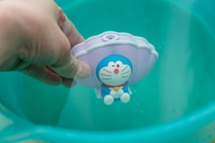 ここからは第2弾。「めざせすいめん!ドラえもんとタケコプター」は、水の中に沈めてから手を離すと、ドラえもんがタケコプターで飛んでいるように水面めがけて勢いよく浮き上がる。水の上にバランスよく浮かばせる遊びも楽しめる。
