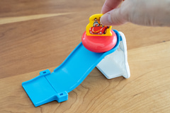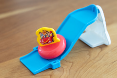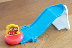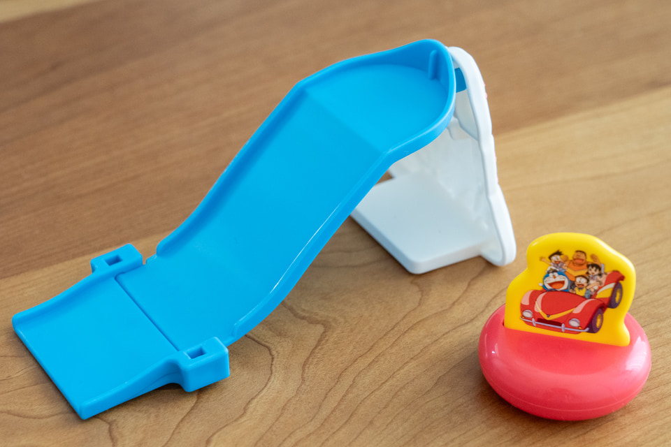 「みんなでとびだせ!ドラえもんのウォータースライダー」は、ドラえもんたちが乗ったパーツを滑らせて遊ぶおもちゃ。水がなくても遊べるが、滑り台の上から水を注ぐとよく滑る。これもお風呂遊びができそう。