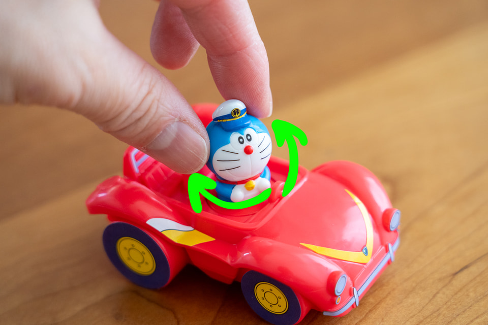 「くるっとカーブ!ドラえもん&バギー」は映画のなかで大活躍するひみつ道具・水中バギーがモチーフのおもちゃ。運転しているドラえもんの首の向きを左・右・正面に変えると、バギーカーの進む方向も変わる。